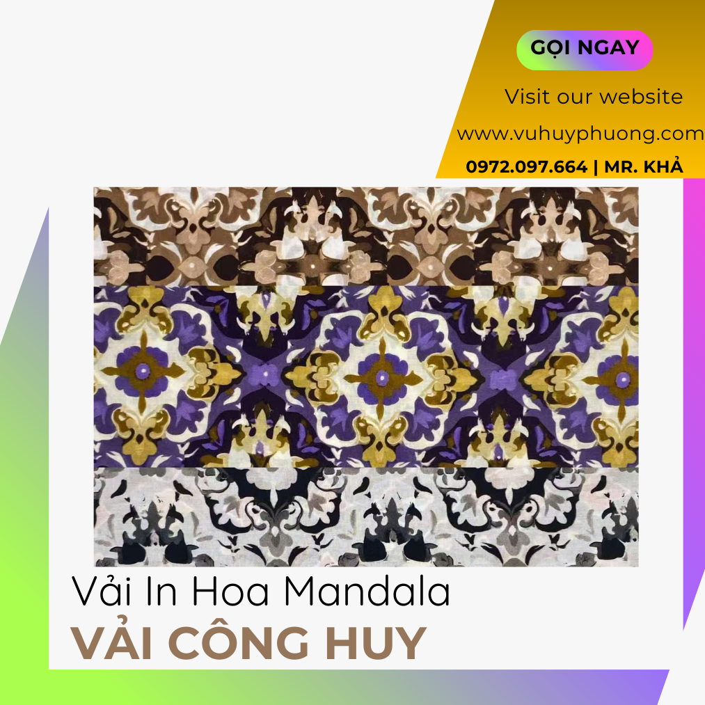 Tại Vải Công Huy, chúng tôi cung cấp Vải In Hoa Mandala với nhiều mẫu họa tiết đa dạng: từ hoa mandala tông trầm huyền bí đến phong cách tropical rực rỡ hay mandala pastel nhẹ nhàng. Mỗi mét vải đều được kiểm tra kỹ về độ mịn, độ rủ, độ bền màu và chất lượng in. Vải Công Huy cam kết mang đến sản phẩm Vải In Hoa Mandala đẹp – bền – chuẩn màu với giá cạnh tranh, phù hợp cho cả khách hàng cá nhân và các xưởng thời trang đang tìm chất liệu mang dấu ấn riêng và đậm chất nghệ thuật.